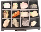 內含12種常見黏土礦物標本大小約7*9cm:高嶺土、彭潤土、蒙脫土、伊利石、陶土、耐火黏土、海泡石、矽藻土、沸土、葉臘石、明礬石、滑石。採用塑膠箱包裝,箱內配置開模分開並有標示名稱。
